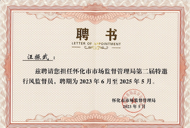 近期從懷化市市場(chǎng)監(jiān)督管理局獲悉,湖南湘鶴集團(tuán)電纜科技股份有限公司黨支部書記汪振武獲聘懷化市市場(chǎng)監(jiān)管局“第二屆特邀行風(fēng)監(jiān)督員”。